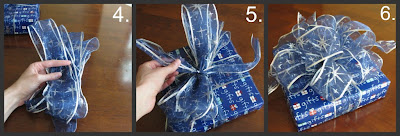 Step 3: Rotate block so opening is at the bottom. Wrap ribbon around sides and tie a bow. My full bow tutorial can be found HERE, but this single image from another project should give you the bow-making gist.
